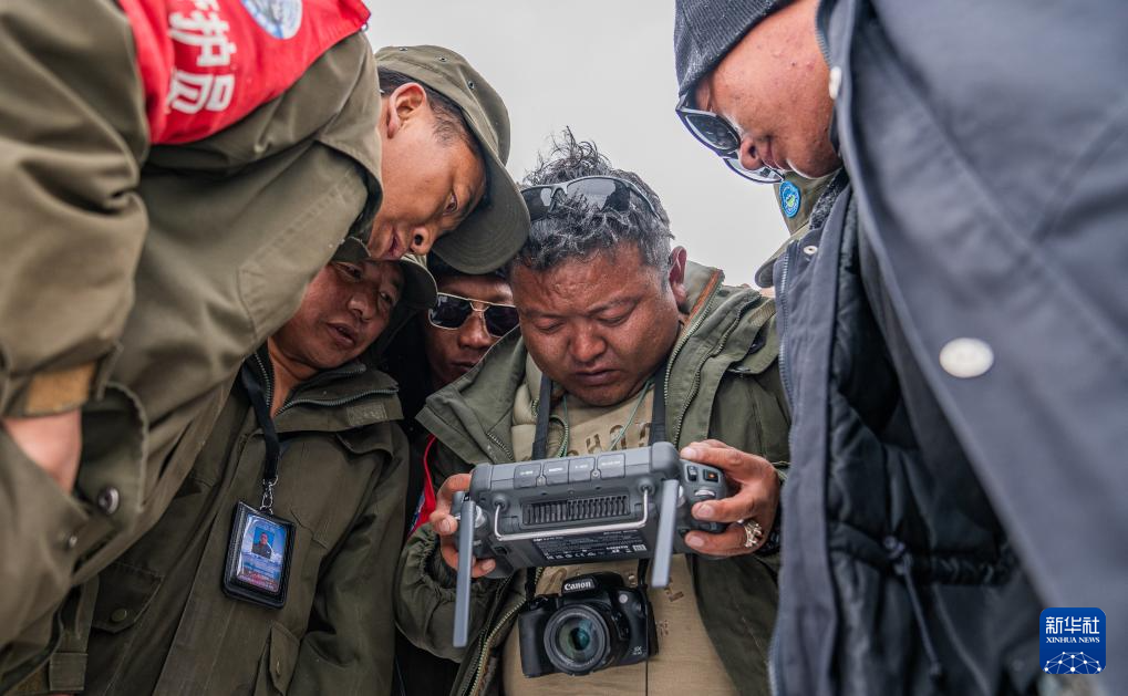 羅布玉杰管護(hù)站站長(zhǎng)格桑倫珠(右二)和隊(duì)員們?cè)诖笱┲胁僮鳠o(wú)人機(jī)觀察藏羚羊遷徙情況(5月10日攝)。新華社記者 丁增尼達(dá) 攝