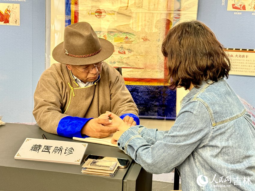 西藏自治區(qū)藏醫(yī)院藏醫(yī)主任醫(yī)師尼瑪為觀眾脈診、講解藏藥知識。人民網記者 李思玥 攝