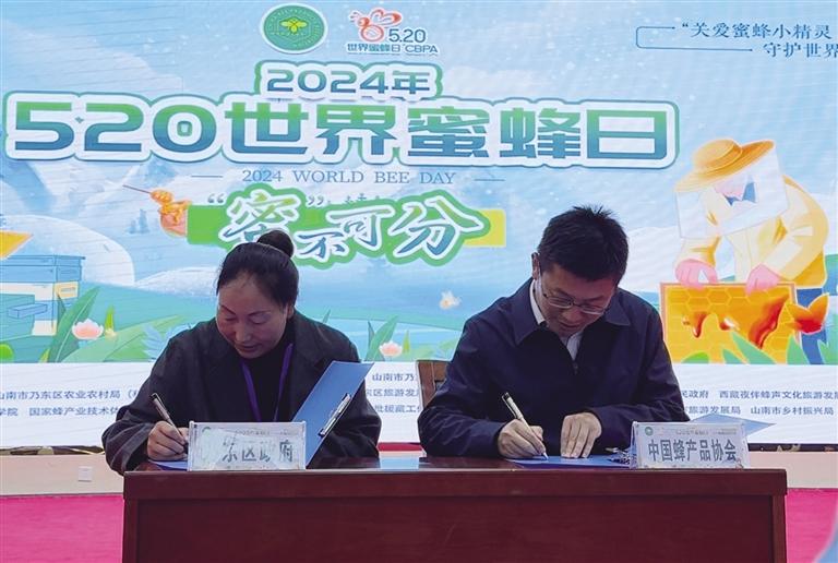 中國(guó)蜂產(chǎn)品協(xié)會(huì)領(lǐng)導(dǎo)與乃東區(qū)政府副區(qū)長(zhǎng)宗巴(左)簽署共建“西藏山花蜂蜜之鄉(xiāng)”協(xié)議。記者 旦增玉珍 攝