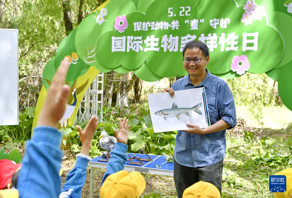 5月22日,西藏大學(xué)生態(tài)環(huán)境學(xué)院教授張繼峰向小學(xué)生普及有關(guān)西藏魚類的知識。新華社記者 張汝鋒 攝