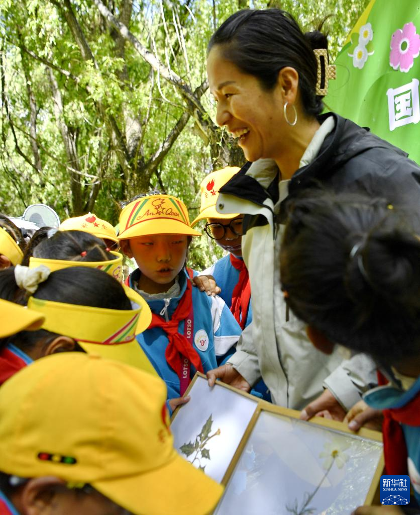 5月22日,西藏大學(xué)生態(tài)環(huán)境學(xué)院副教授索南措向小學(xué)生普及植物多樣性知識。新華社記者 張汝鋒 攝