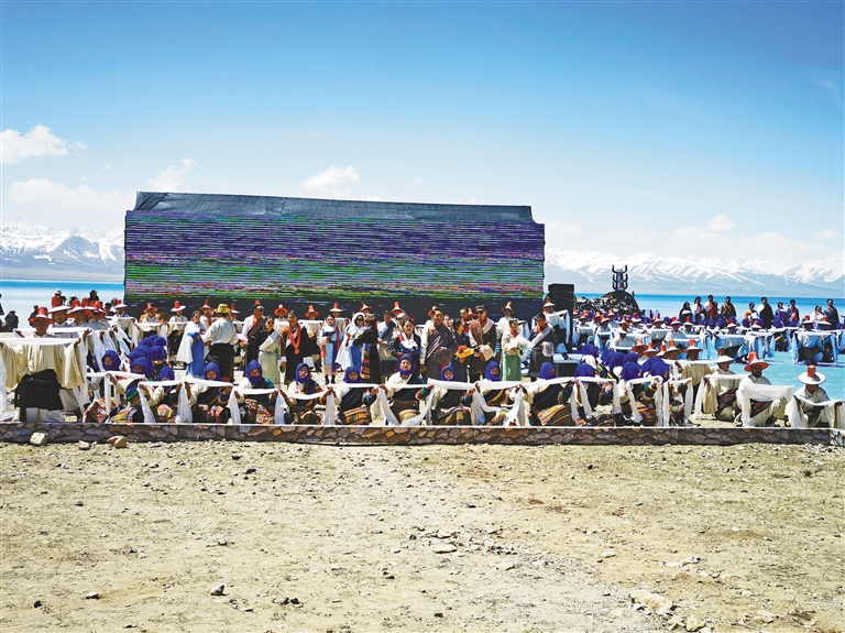 由300名演員將象征平安、吉祥的馬、牦牛、牛角、五彩哈達(dá)等元素融入表演全過(guò)程,藝術(shù)地展現(xiàn)獨(dú)有的開湖祈福場(chǎng)景。