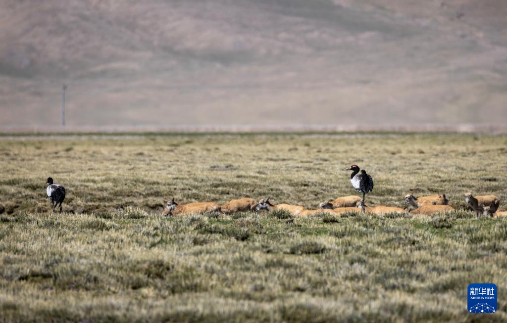 黑頸鶴在濕地和藏羚羊一起覓食(6月8日攝)。新華社記者 晉美多吉 攝