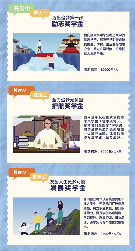 今年高考分?jǐn)?shù)揭曉在即,項(xiàng)目升級(jí)為“夢(mèng)想+”大學(xué)生助力計(jì)劃,除繼續(xù)重點(diǎn)獎(jiǎng)勵(lì)剛考上大學(xué)的勵(lì)志新生每人1萬(wàn)元“勵(lì)志獎(jiǎng)學(xué)金”外,之后學(xué)生在本碩博直到臨畢業(yè)期間,如有困難仍可繼續(xù)申請(qǐng)“護(hù)航獎(jiǎng)學(xué)金”(5000元/人/年)和“發(fā)展獎(jiǎng)學(xué)金”(2500元/人/次)。為了能夠讓更多學(xué)子獲得獎(jiǎng)學(xué)金,今年項(xiàng)目繼續(xù)聯(lián)合杭州嘉互助學(xué)基金會(huì)開通公募渠道,公募款將100%用于獎(jiǎng)勵(lì)勵(lì)志學(xué)子。