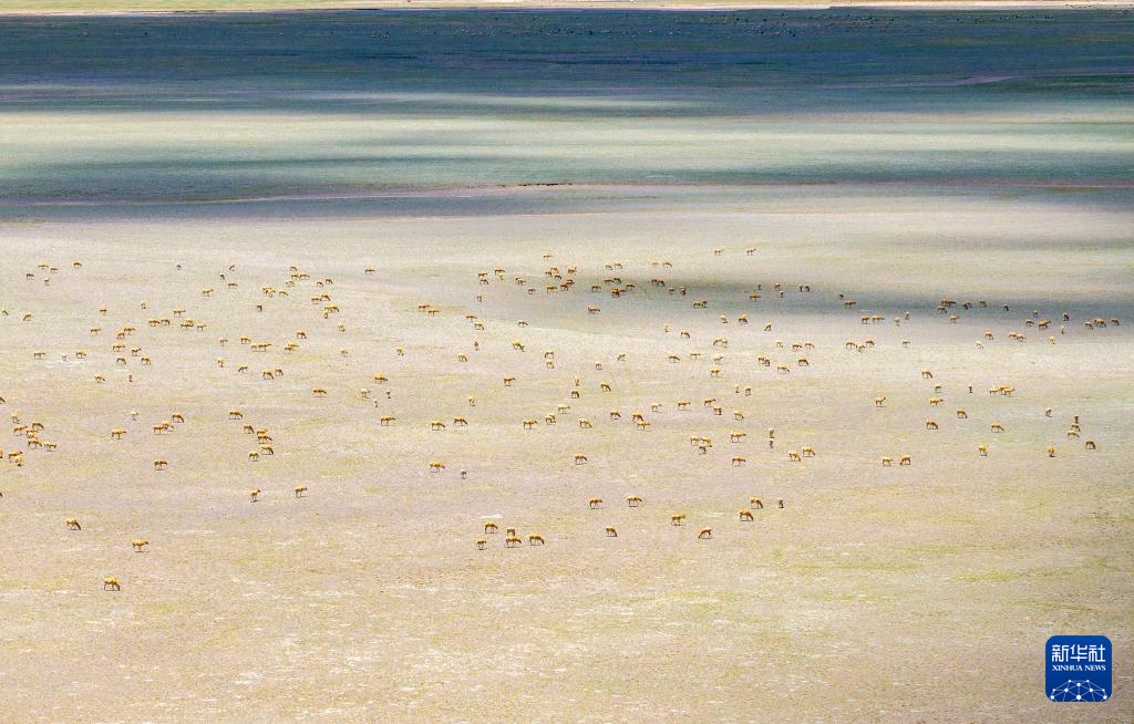 藏羚羊在魯確塘草原集結(jié)(無人機照片,6月8日攝)。新華社記者 姜帆 攝??