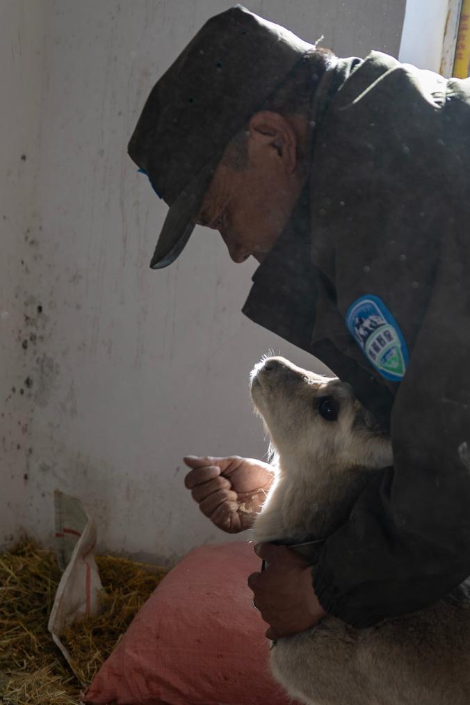 羅布玉杰站的野生動(dòng)物專業(yè)管護(hù)隊(duì)員在出發(fā)巡護(hù)前給站里救護(hù)的受傷藏原羚喂糌粑(5月7日攝)。新華社記者 姜帆 攝