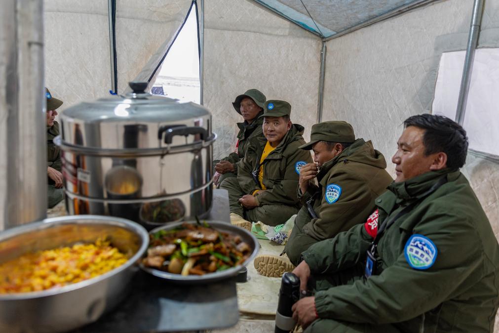 野生動(dòng)物專業(yè)管護(hù)隊(duì)員們?cè)谘沧o(hù)途中宿營(yíng)的帳篷內(nèi)準(zhǔn)備吃飯(5月7日攝)。新華社記者 姜帆 攝