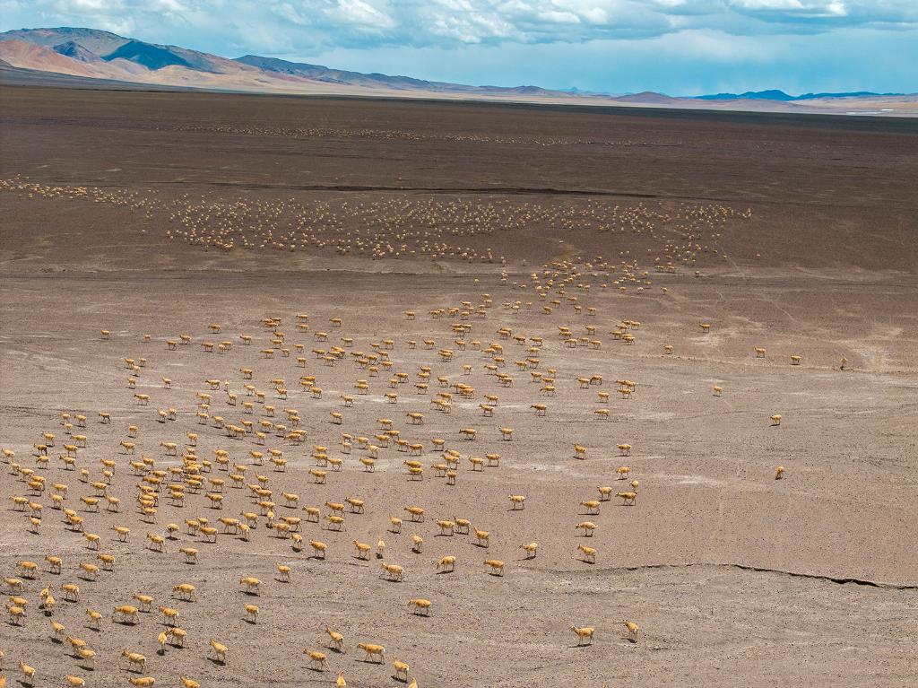 2024年5月10日,在羌塘國(guó)家級(jí)自然保護(hù)區(qū),大群懷孕的雌性藏羚羊開始集結(jié)成群,向產(chǎn)羔地遷徙。