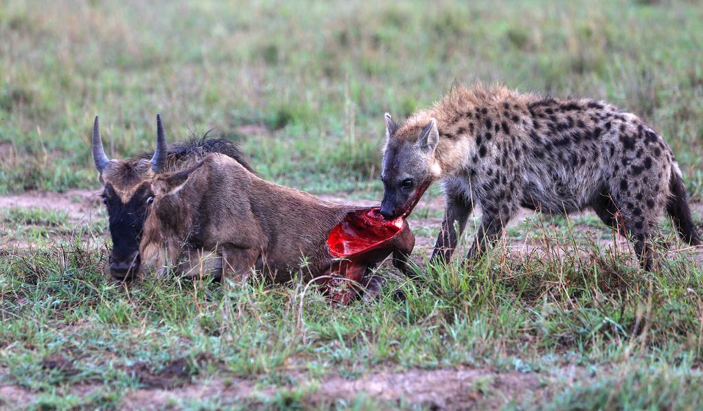 ↑ 在馬賽馬拉國(guó)家保護(hù)區(qū),一頭遷徙中的角馬成了鬣狗的食物。在角馬遷徙過(guò)程中,獅子、獵豹、花豹、鬣狗以及馬拉河中的鱷魚等掠食動(dòng)物環(huán)伺其周,伺機(jī)而動(dòng)。