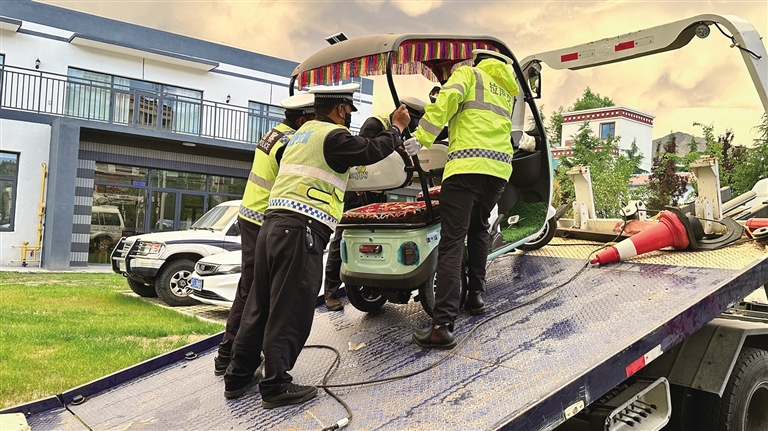 6月19日18時許,記者來到拉薩市城關(guān)區(qū)江蘇東路與嘎瑪貢桑路交叉口,此時正值下班高峰期,各類車輛川流不息,十分繁忙,拉薩市公安局交警支隊(duì)城南大隊(duì)的民警們一邊疏導(dǎo)交通,一邊開展電動三輪、四輪車專項(xiàng)整治行動。沒過多久,一輛電動三輪車準(zhǔn)備通過路口,民警丹增發(fā)現(xiàn)該車輛存在非法改裝現(xiàn)象,便立即上前將車輛引導(dǎo)至安全位置,檢查后發(fā)現(xiàn)駕駛?cè)怂阶詾檐囕v加裝遮陽篷,上路行駛存在較大安全隱患,便按照相關(guān)法律法規(guī)暫扣車輛。丹增告訴記者:“我們會將暫扣的車輛統(tǒng)一停放,等駕駛?cè)私邮芴幜P并提交相關(guān)資料后,才能領(lǐng)回車輛?!?/p>