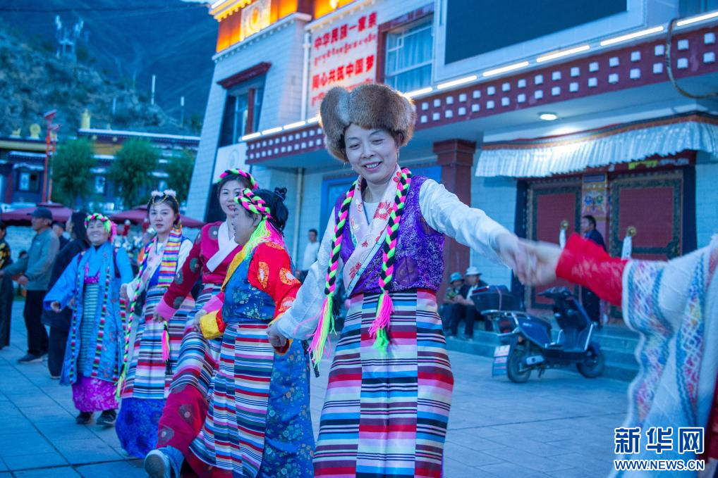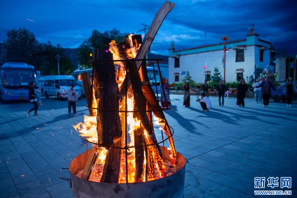 6月24日,游客在扎西曲登社區(qū)廣場(chǎng)體驗(yàn)篝火廣場(chǎng)舞。新華網(wǎng) 旦增努布 攝