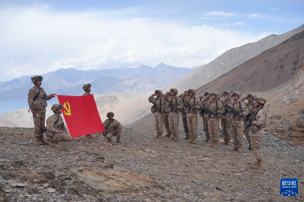 西藏阿里軍分區(qū)普爾楚邊防連秋迪儉革拉哨所巡邏官兵在海拔5700米的巡邏點(diǎn)位組織重溫入黨誓詞活動(dòng)(6月29日攝)。新華社發(fā)(戴學(xué)武 攝)