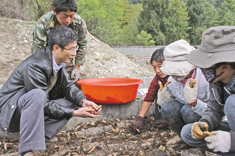 廣東省第七批援藏工作隊(duì)成員肖國鑫(左一)在波密縣指導(dǎo)當(dāng)?shù)剞r(nóng)牧民種植天麻。