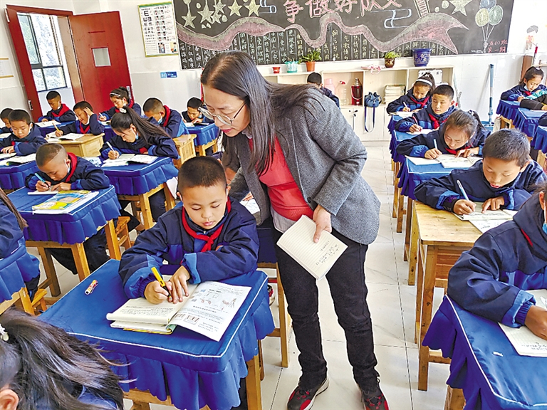 廣東省第三批“組團(tuán)式”教育援藏隊(duì)員韓詠梅在察隅縣小學(xué)授課。