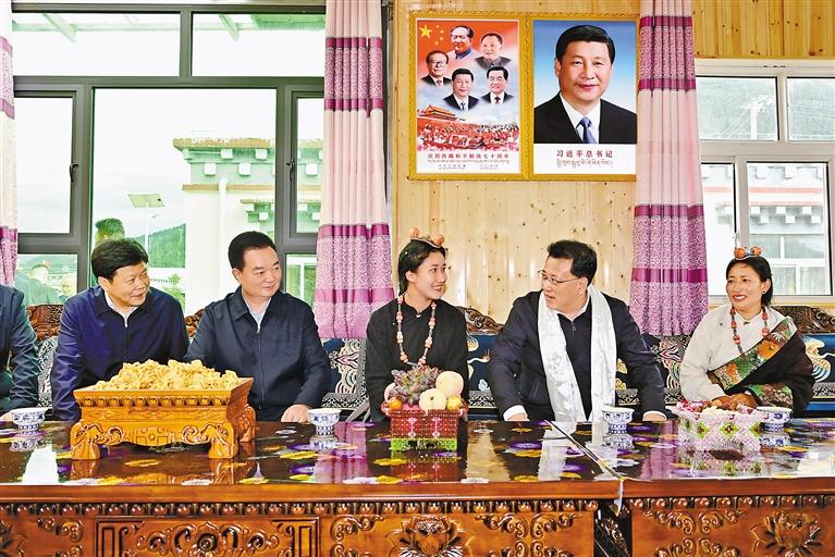 7月8日至10日,重慶市代表團(tuán)來(lái)藏考察。這是代表團(tuán)在昌都市類(lèi)烏齊縣扎西貢村美麗鄉(xiāng)村示范點(diǎn)與基層群眾親切交流。 記者 旦增西旦 攝