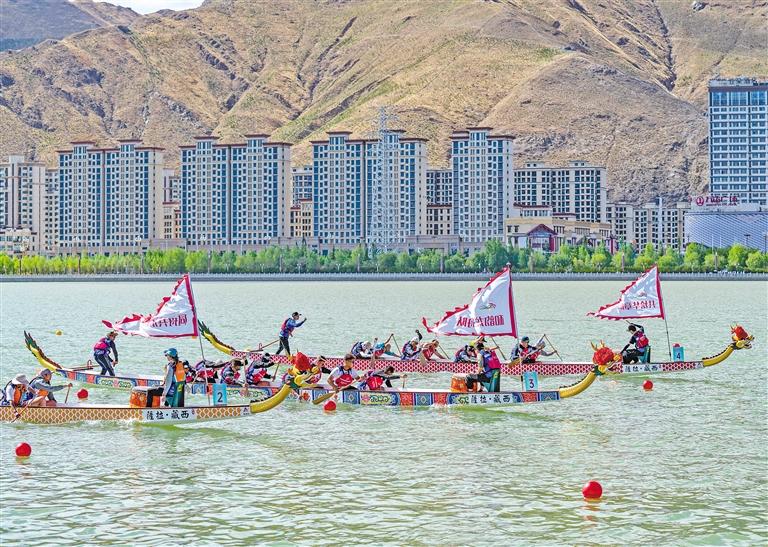 在拉薩首次舉辦的中國(guó)海拔最高的城市龍舟賽。 新華社記者 孫非 攝