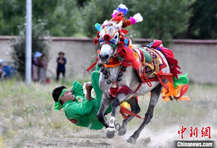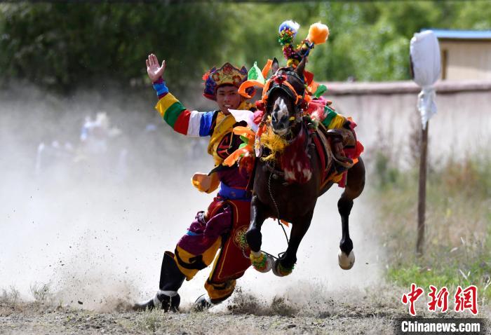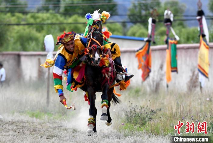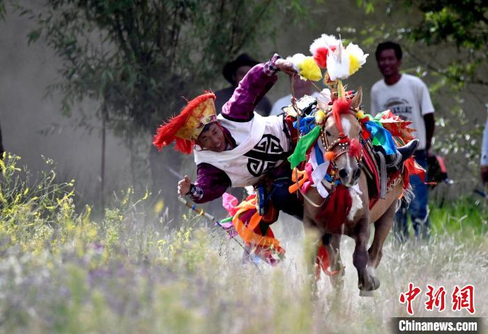 7月27日,西藏拉薩市桑達村迎來“望果節(jié)”,村民們舉行賽馬活動慶祝?!巴?jié)”是西藏傳統(tǒng)的豐收節(jié),具體日期隨各地莊稼成熟的時間而變化。“望果節(jié)”期間,按照習俗,各地都會舉辦賽馬比賽。圖為騎手進行馬術(shù)表演。中新社記者 李林 攝