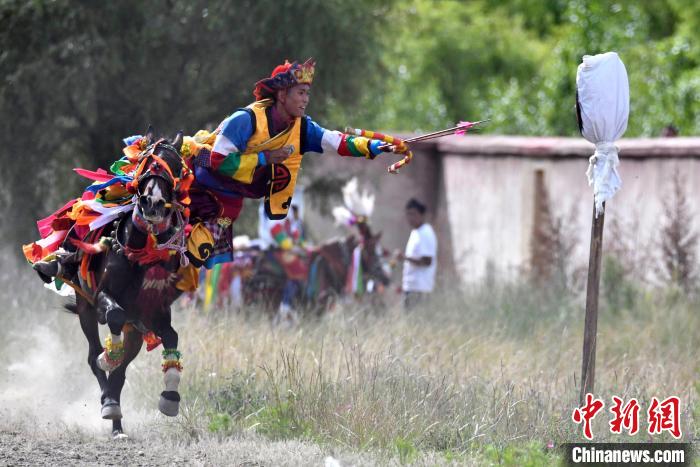 7月27日,西藏拉薩市桑達村迎來“望果節(jié)”,村民們舉行賽馬活動慶祝。“望果節(jié)”是西藏傳統(tǒng)的豐收節(jié),具體日期隨各地莊稼成熟的時間而變化?!巴?jié)”期間,按照習俗,各地都會舉辦賽馬比賽。圖為騎手進行馬上射箭表演。中新社記者 李林 攝