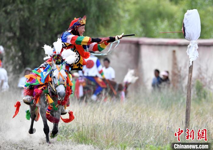 7月27日,西藏拉薩市桑達村迎來“望果節(jié)”,村民們舉行賽馬活動慶祝?!巴?jié)”是西藏傳統(tǒng)的豐收節(jié),具體日期隨各地莊稼成熟的時間而變化。“望果節(jié)”期間,按照習俗,各地都會舉辦賽馬比賽。圖為騎手進行馬上射擊表演。中新社記者 李林 攝