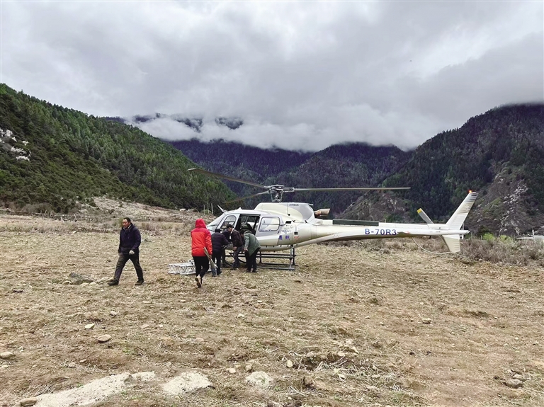 直升機裝載相關(guān)設(shè)備,準備起飛監(jiān)控堰塞湖情況。