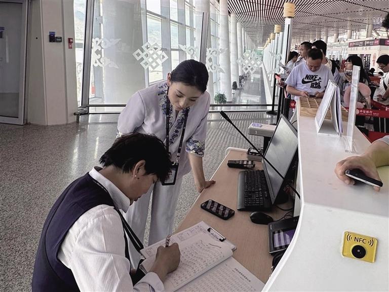 日常工作中,達(dá)娃曲珍也會發(fā)揮自己的語言優(yōu)勢,為藏族旅客提供幫助。“有些家鄉(xiāng)人確實不太會講普通話,用方言進(jìn)行交流會讓他們覺得很親切,溝通過程也會順暢很多。”達(dá)娃曲珍還主動學(xué)習(xí)英語,掃清與外國游客的溝通障礙。常用服務(wù)用語的熟練掌握,為她更好地服務(wù)旅客打下了堅實基礎(chǔ)。