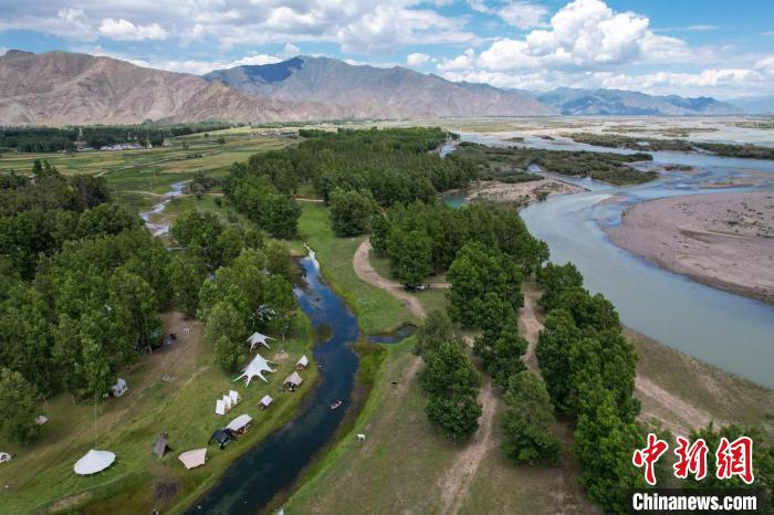 8月11日,人們在拉薩市林周縣神秘樹林搭帳篷“過林卡”。(航拍畫面)中新社記者 江飛波 攝