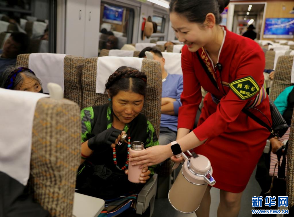 拉薩開(kāi)往日喀則C885次列車長(zhǎng)為旅客送開(kāi)水。新華社發(fā)(馬生明 攝)