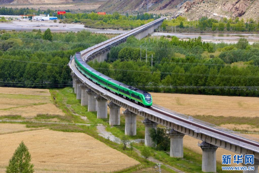 復(fù)興號(hào)動(dòng)車組穿過(guò)拉日鐵路拉薩河大橋。新華社發(fā)(馬生明 攝)