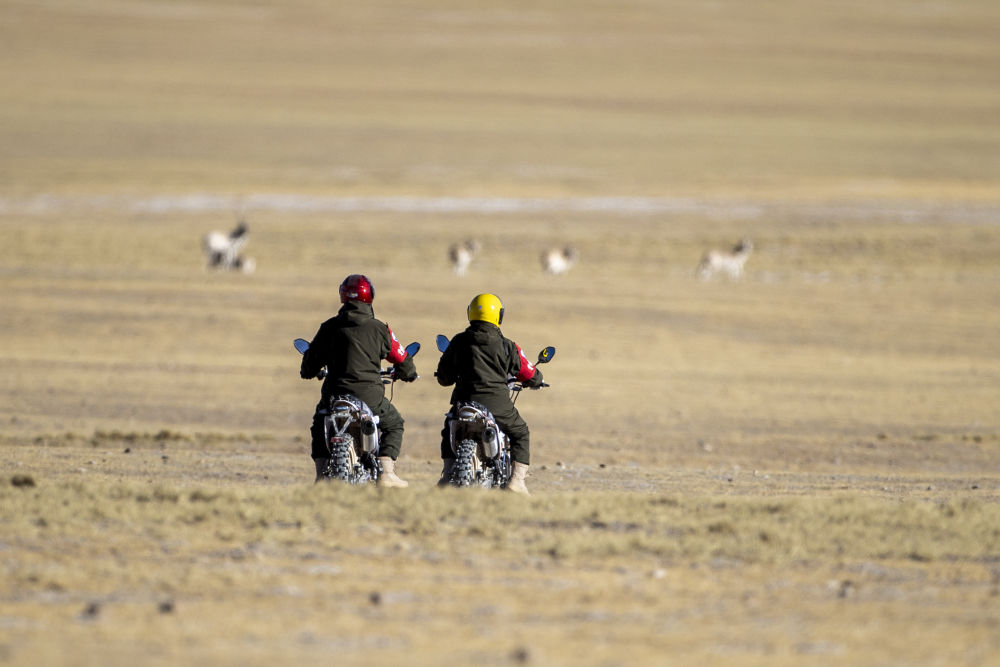 2023年12月17日,在西藏羌塘國家級(jí)自然保護(hù)區(qū),野生動(dòng)物管護(hù)隊(duì)員騎著摩托車觀察藏羚羊。
