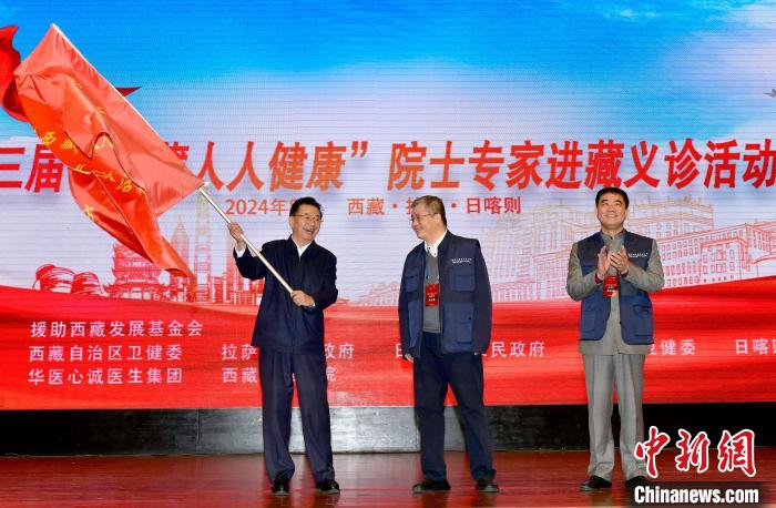 圖為第三屆“西藏人人健康”院士專家進(jìn)藏義診活動啟動儀式上,西藏自治區(qū)副主席甲熱·洛桑丹增(圖左)為義診專家團(tuán)隊(duì)代表授旗。李林 攝
