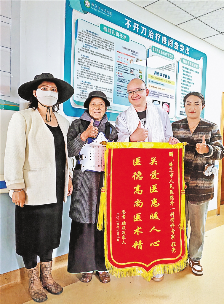 圖為患者康復后為援藏醫(yī)生贈送錦旗表達感謝。(圖片由林芝市人民醫(yī)院提供)