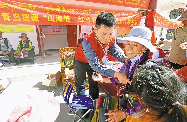 圖為青島援藏組“山海情·紅馬甲”醫(yī)療志愿者服務隊為日喀則市桑珠孜區(qū)群眾義診。記者 李洲 攝