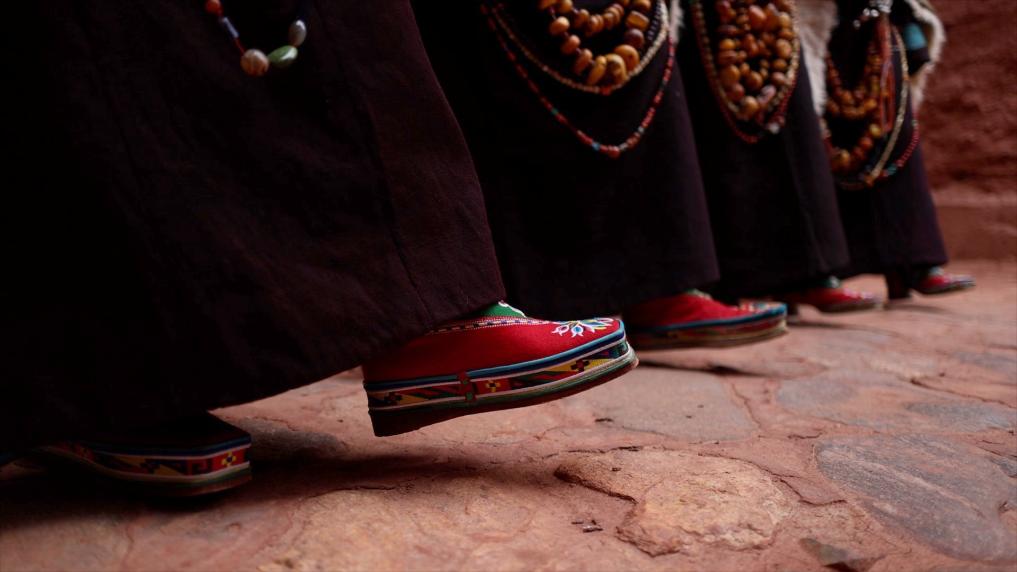 普蘭縣科迦村里有7戶人家保存著7套祖?zhèn)鞣?,一套重達25公斤,裝飾有黃金、白銀、松石、瑪瑙、珊瑚、珍珠等,承載和沉淀了百年時光,堪稱“穿在身上的千年史”。