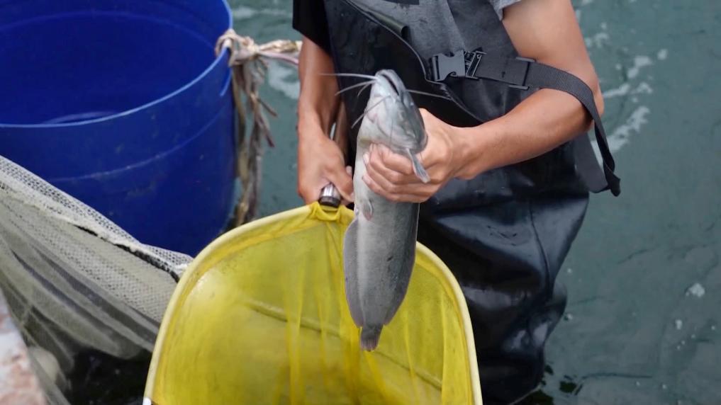 農(nóng)場(chǎng)職工正在撈魚(yú)。