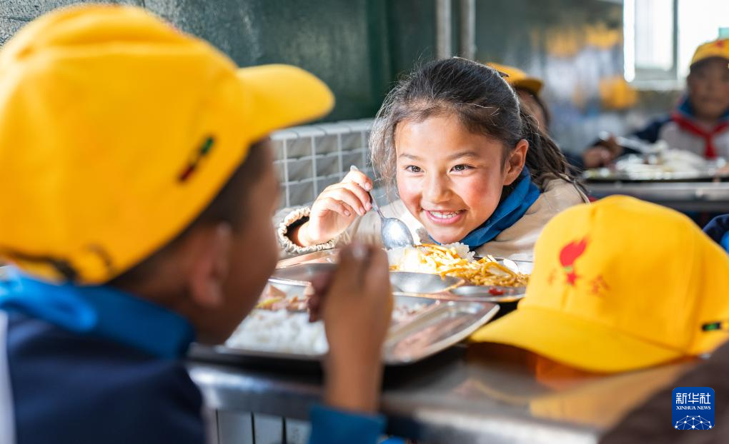 娘蒲鄉(xiāng)中心小學(xué)的學(xué)生在食堂用餐(9月3日攝)。新華社記者 丁增尼達(dá) 攝