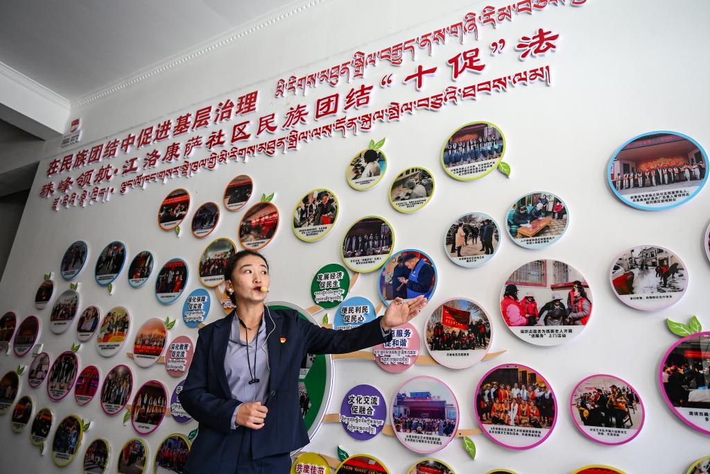 9月2日,江洛康薩社區(qū)黨支部書(shū)記次旦央吉介紹社區(qū)情況。新華社記者孫瑞博 攝