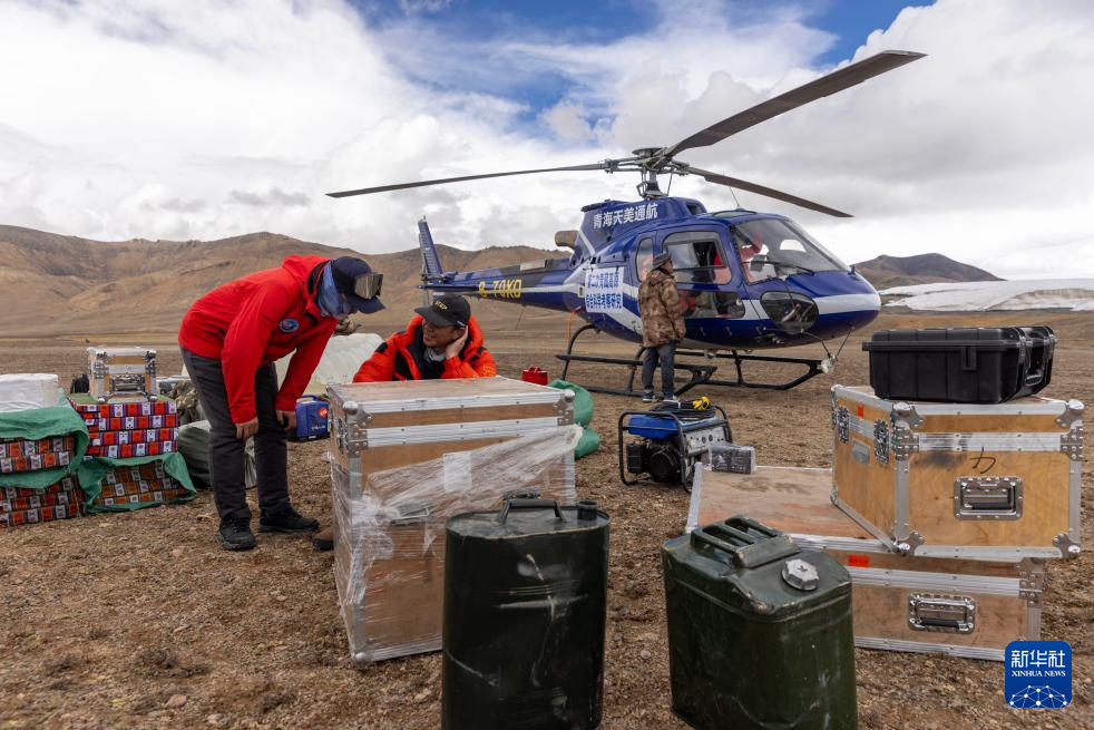 9月9日,徐柏青(中)和同事安排直升機(jī)將科考物資從海拔5400米的第二次青藏科考普若崗日冰原大本營運(yùn)往海拔6100米的“Dome.C”點(diǎn)。新華社記者 姜帆 攝