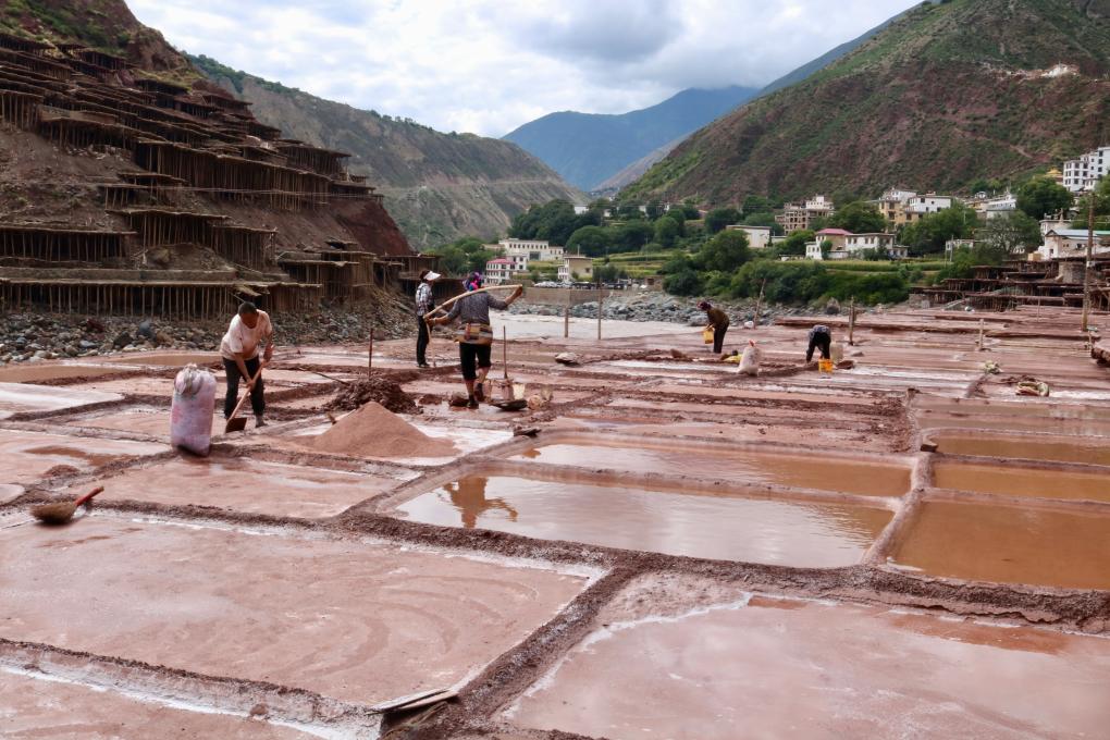 當(dāng)?shù)卮迕袢员3种嫉氖止覃}方式,他們從瀾滄江畔的鹽井、鹽池中取出鹵水倒入鹽田,經(jīng)陽光蒸曬、風(fēng)干,結(jié)晶成鹽。遠(yuǎn)遠(yuǎn)望去,鹽田錯(cuò)落有致,景色奇美。