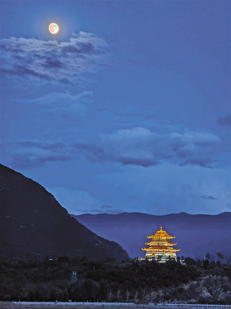 圖為在林芝市巴宜區(qū)尼洋河畔眺望中秋圓月和尼洋閣。記者 謝筱純 王珊 攝