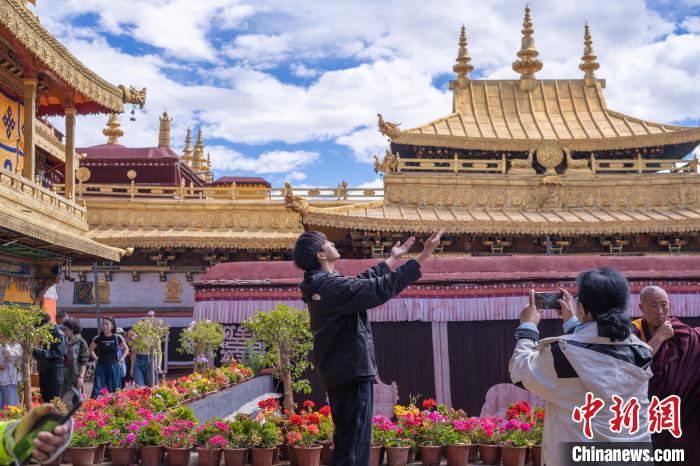9月17日,游客在西藏拉薩大昭寺金頂前留影。中秋佳節(jié),距今已有1300多年歷史、2000年作為布達拉宮擴展項目列入《世界遺產(chǎn)名錄》的拉薩大昭寺迎來眾多游客。中新社記者 貢嘎來松 攝