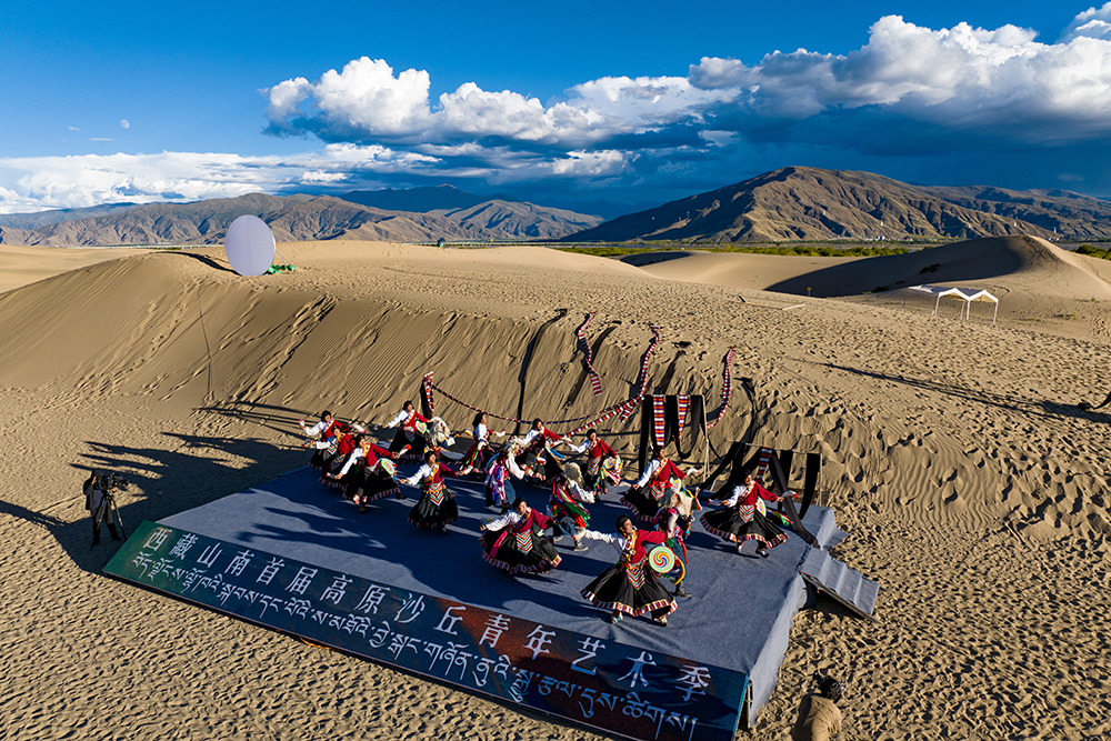 西藏山南首屆“高原沙丘青年藝術季”非遺歌舞展演現(xiàn)場(無人機照片,9月15日攝)。新華網 旦增努布 攝