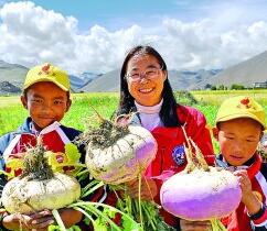 在珠峰腳下的田地里,生態(tài)學(xué)專家和學(xué)生們一起展示收獲的蕪菁。新華社發(fā)