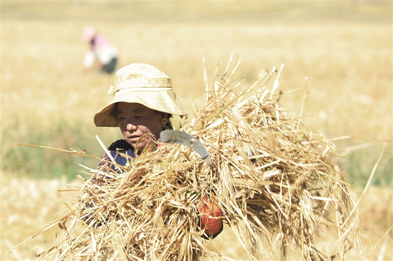 金秋九月,風(fēng)吹麥浪、穗粒飽滿,連日來,在墨竹工卡縣金黃色的農(nóng)田里,處處可見勤勞的農(nóng)民們搶抓時(shí)機(jī),開展小油菜和青稞收割、晾曬、搬運(yùn)、儲(chǔ)藏,確保糧食顆粒歸倉(cāng)。