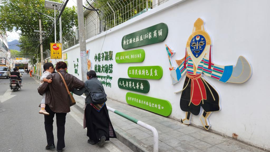 配合路政部門把洽瑪崗路改為單行道,讓街道靜下來;協(xié)同三大運營商,把街上縱橫交錯的“飛線”收進沿街橋架,還行人一片藍天;對接專業(yè)設(shè)計團隊,以本地犬種拉薩阿普索犬設(shè)計社區(qū)IP形象“嘎嘎”(意為快樂),街角的墻繪、樹上的引導牌、商戶的門臉上都能看到這只可愛的小狗……社工旦增晉美對社區(qū)的變化如數(shù)家珍。