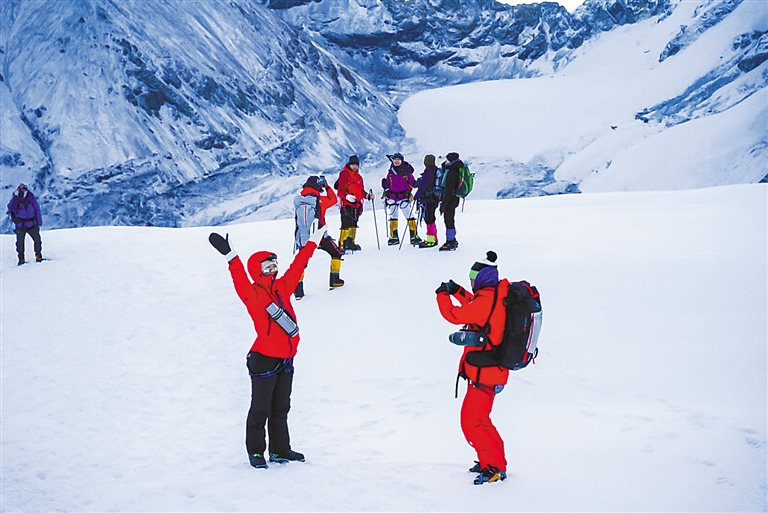 登頂成功的登山愛(ài)好者在洛堆峰頂合影留念。