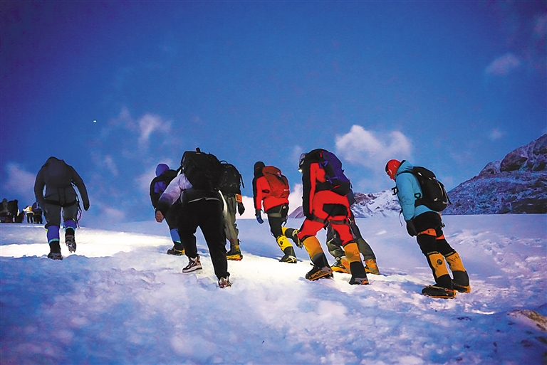此前,為了讓山友熟悉相關(guān)設(shè)備的使用,自治區(qū)登山隊(duì)的向?qū)円呀?jīng)多次組織、演練設(shè)備使用。功夫不負(fù)有心人,此時(shí)此刻,經(jīng)過(guò)認(rèn)真學(xué)習(xí)的山友們正熟練地運(yùn)用著這幾天學(xué)到的技能向著山頂前進(jìn)。隨著海拔的持續(xù)上升,大家只聽(tīng)到來(lái)風(fēng)聲在耳邊呼嘯,頭頂是炫目迷人的陽(yáng)光。路程過(guò)半,山友們的身體和意志正在經(jīng)歷最嚴(yán)峻的考驗(yàn),沉重的大口呼吸聲此起彼伏。
