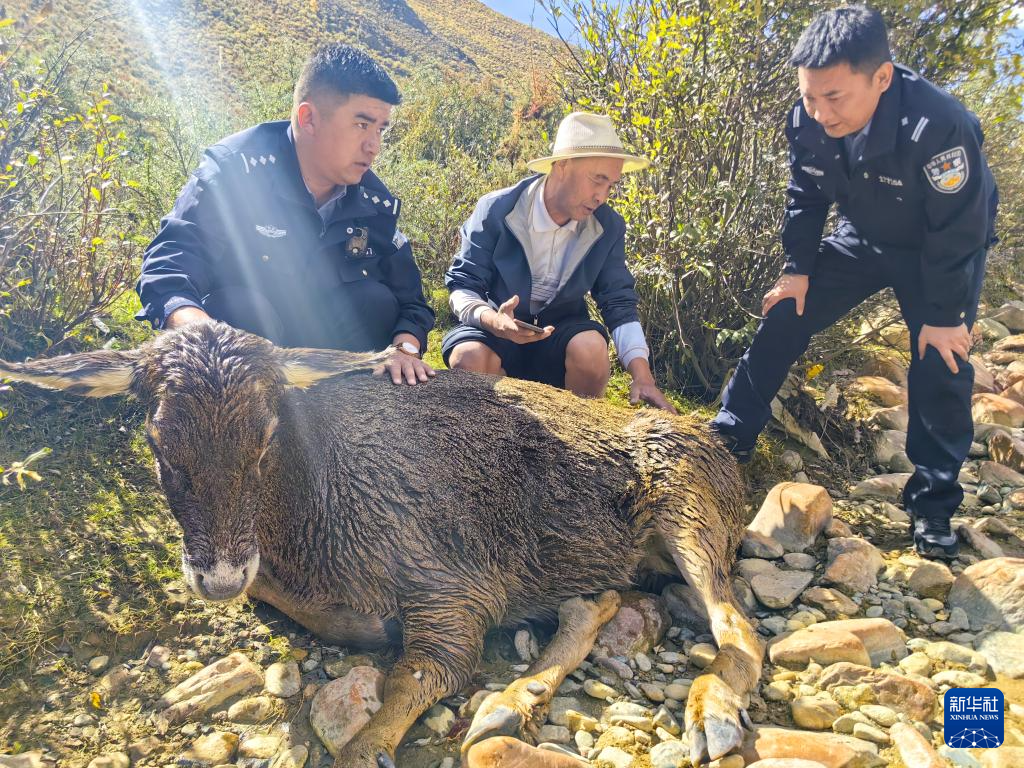 10月10日上午,拉薩市扎西崗鄉(xiāng)公安干警和獸醫(yī)在救援馬鹿。新華社發(fā)(土登攝)
