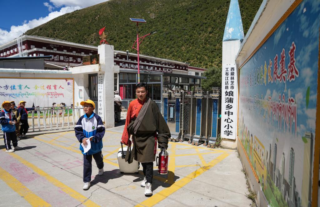 娘蒲鄉(xiāng)中心小學(xué)門口,王登領(lǐng)著兒子貢喬熱旦(左)準備回家(9月4日攝)。新華社記者 晉美多吉 攝