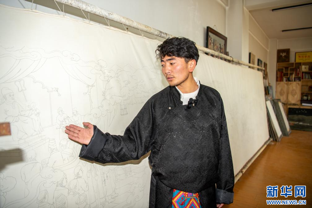 10月17日,卡若區(qū)嘎瑪鄉(xiāng)比如村的畫師鄧珠尼瑪在講述新主題唐卡創(chuàng)新過(guò)程。新華網(wǎng) 旦增努布 攝