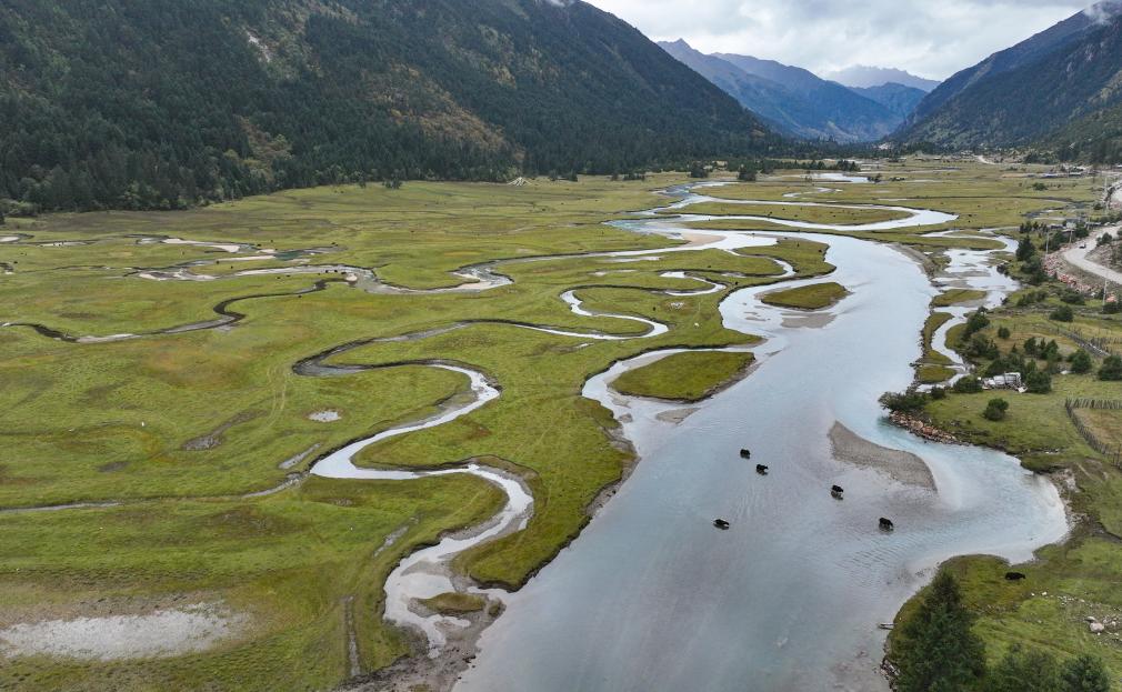 10月4日,在林芝工布江達縣,一隊牦牛涉水通過河流(無人機照片)。新華社記者 晉美多吉 攝